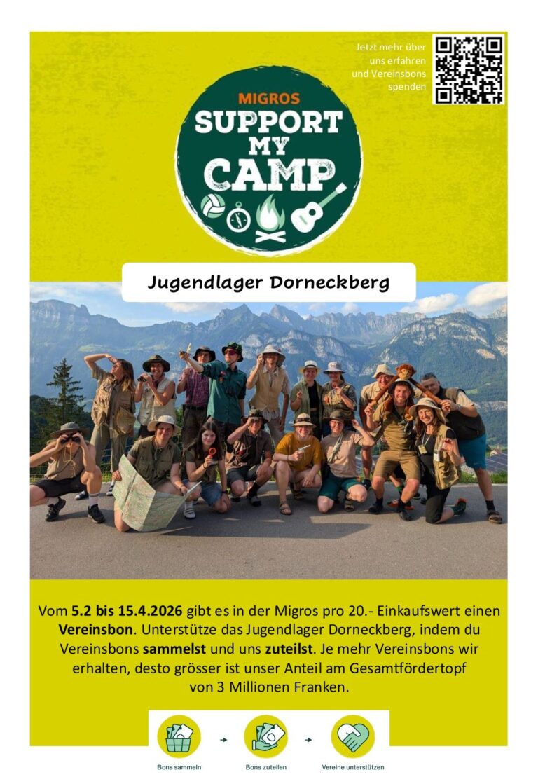 Vom 5. Februar bis 15. April 2026 erhaltet ihr in der Migros pro 20 CHF Einkaufswert einen Vereinsbon. Diese Bons können unserem Verein Jugendlager Dorneckberg online zugeteilt werden.